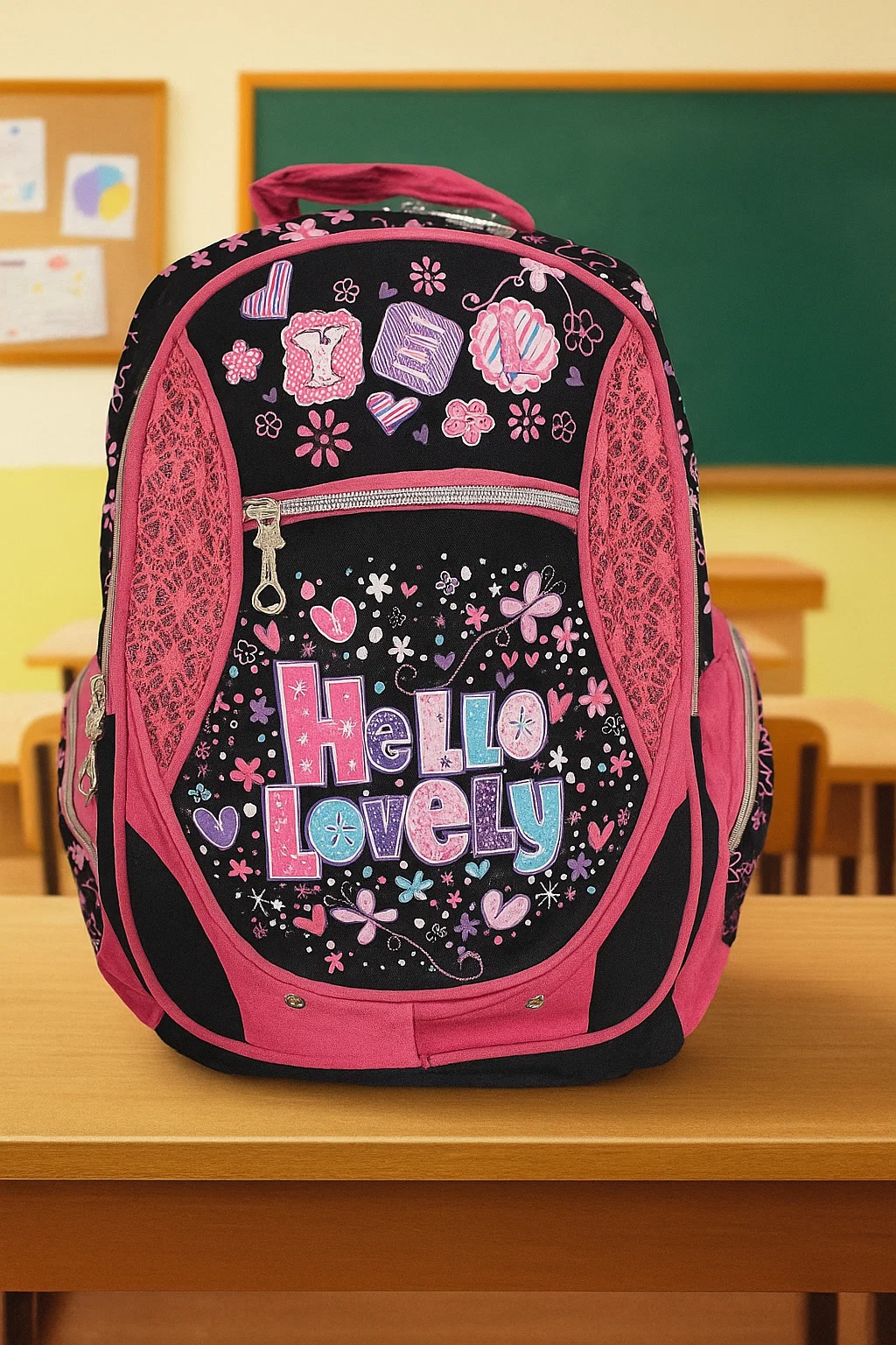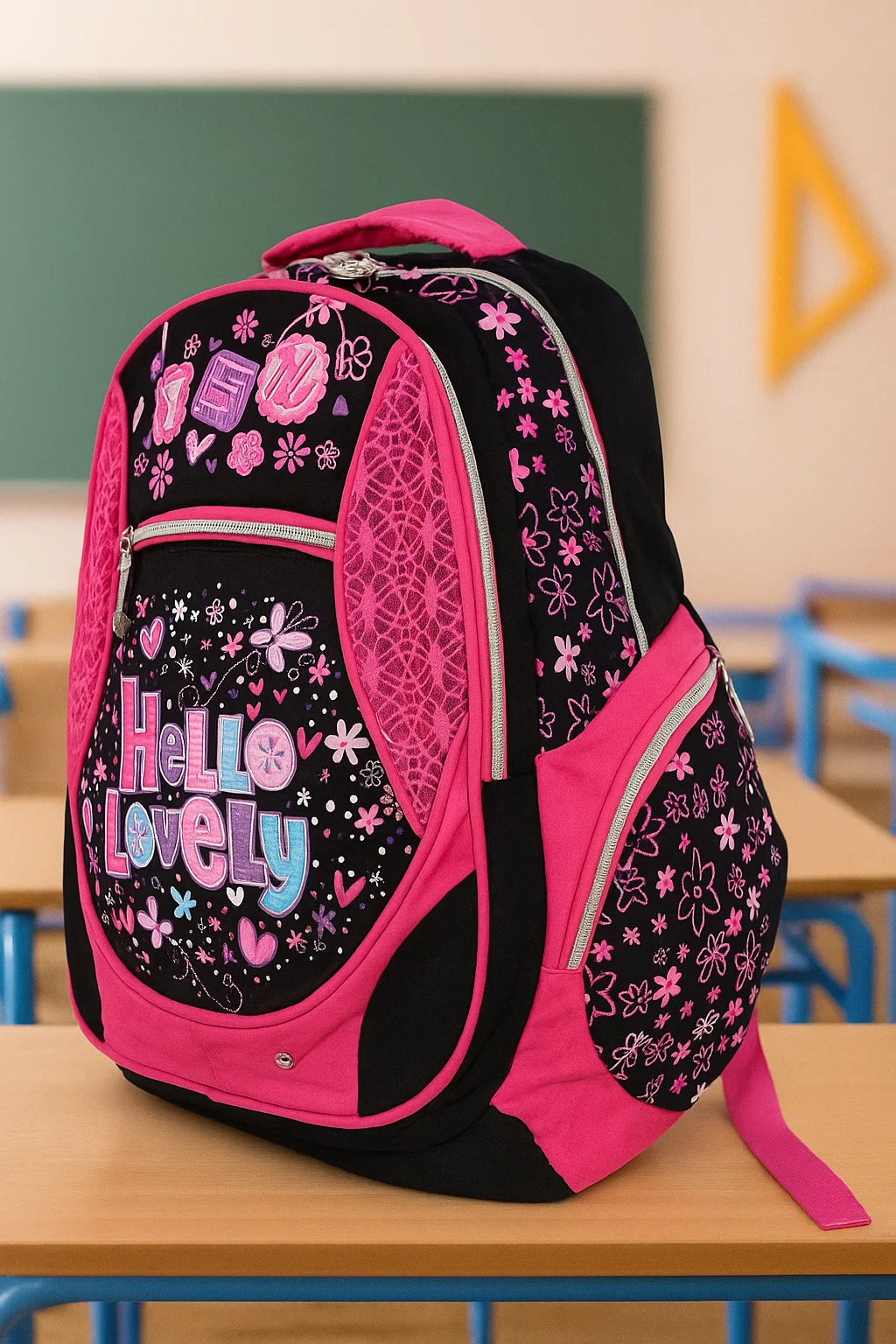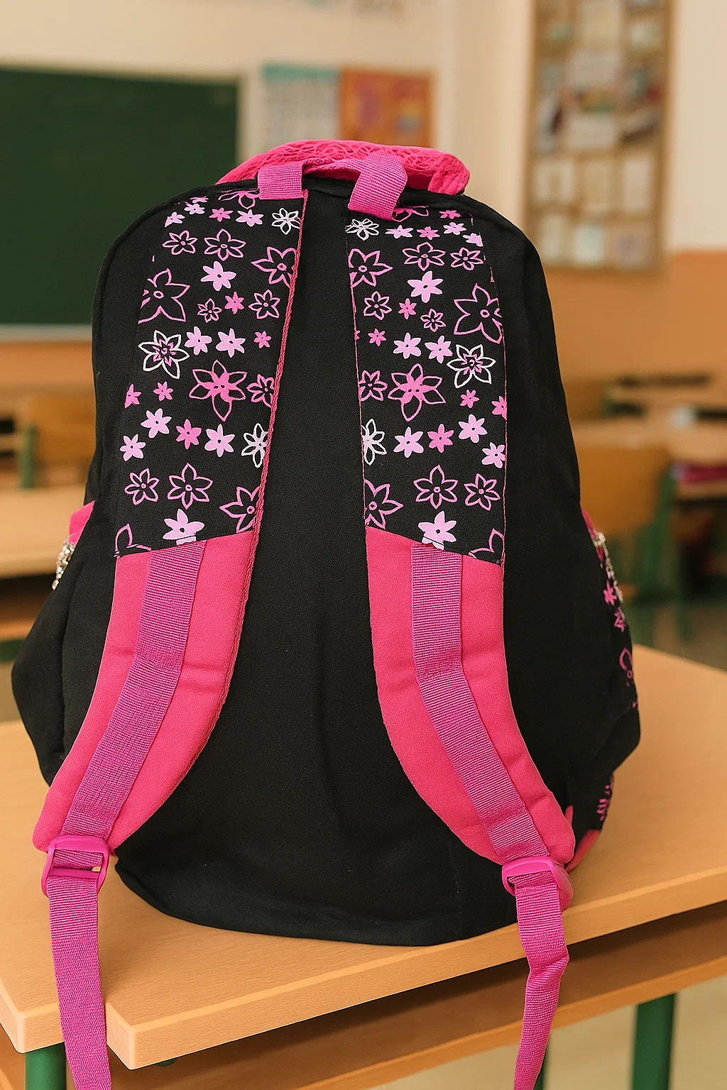 Ghiozdan Scolar cu buzunare laterale si fermoare Flower Negru/Roz, 43x30x16 Mare –GSF3